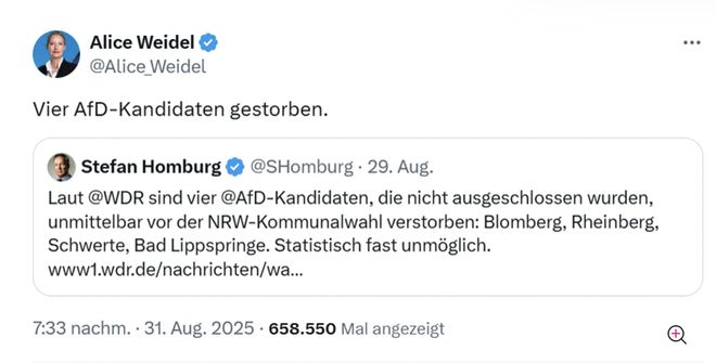 这则帖文也获得德国选择党联合爱丽丝·魏德尔的转发。她还写道:四名候选人死亡。许多网友质疑连续这么多名候选人去世,而且是德国选择党的候选人。